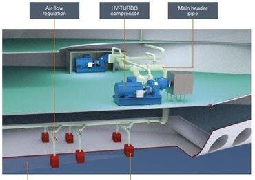 Air lubrication technology is based on blowing micro air bubbles out under the hull of the vessel. The air bubble distribution across the hull’s surface, reduces the resistance generated between the ship’s hull and the water, thus generating an estimated fuel saving of up to 7-10%. Air Lubrication Systems featuring NAVISTURBO by ChartMarine can be used in all types of vessel operations.