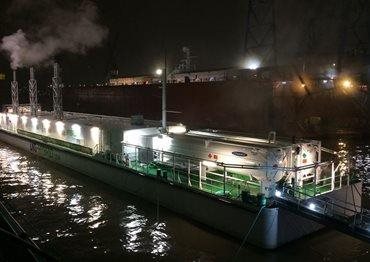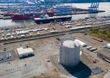 For example, this bunkering terminal in Norway fuels a fleet of feeder vessels serving offshore fish farms. An integral evaporation plant vaporizes LNG to provide natural gas for the boilers at the adjacent fish feed production factory.