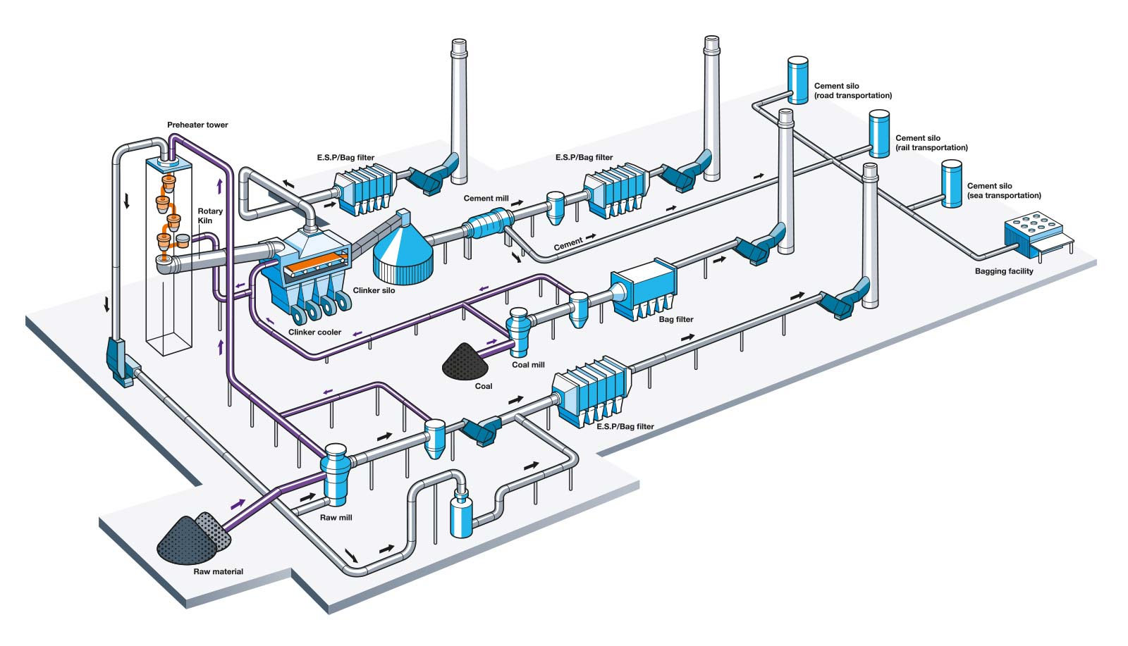 Our centrifugal fans are used to draw exhaust air from the Kiln preheater as well as the clinker cooler. Our fans can also be used in the cooling process to circulate fresh air to the clinker to cool down the material.